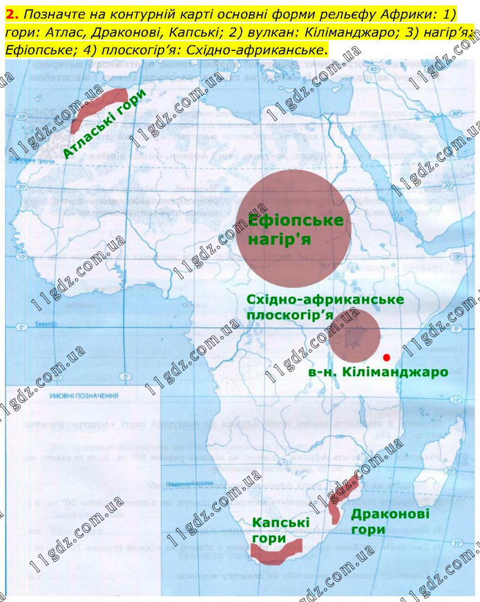 Позначте на контурній карті основні форми рельєфу Африки: 1) гори: Атлас, Драконові, Капські; 2) вулкан: Кіліманджаро; 3) нагір’я: Ефіопське; 4) плоскогір’я: Східно-африканське.