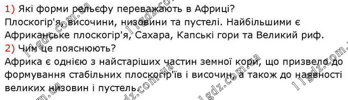 1) Які форми рельєфу переважають в Африці? Плоскогір'я, височини, низовини та пустелі. Найбільшими є Африканське плоскогір'я, Сахара, Капські гори та Великий риф. 2) Чим це пояснюють? Африка є однією з найстаріших частин земної кори, що призвело до формування стабільних плоскогір'їв і височин, а також до наявності великих низовин і пустель.