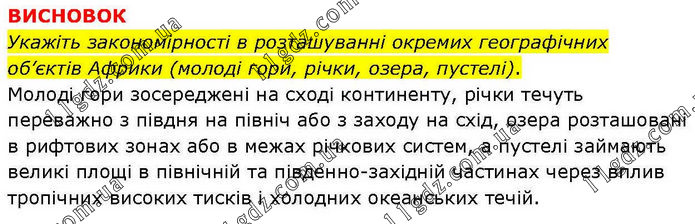 ВИСНОВОК Укажіть закономірності в розташуванні окремих географічних об’єктів Африки (молоді гори, річки, озера, пустелі). Молоді гори зосереджені на сході континенту, річки течуть переважно з півдня на північ або з заходу на схід, озера розташовані в рифтових зонах або в межах річкових систем, а пустелі займають великі площі в північній та південно-західній частинах через вплив тропічних високих тисків і холодних океанських течій.