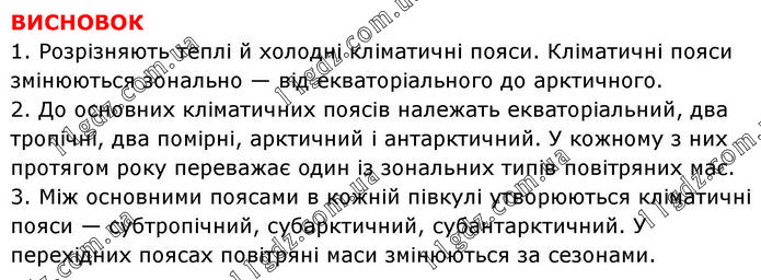 ВИСНОВОК 1. Розрізняють теплі й холодні кліматичні пояси. Кліматичні пояси змінюються зонально — від екваторіального до арктичного. 2. До основних кліматичних поясів належать екваторіальний, два тропічні, два помірні, арктичний і антарктичний. У кожному з них протягом року переважає один із зональних типів повітряних мас. 3. Між основними поясами в кожній півкулі утворюються кліматичні пояси — субтропічний, субарктичний, субантарктичний. У перехідних поясах повітряні маси змінюються за сезонами.