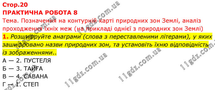 ПРАКТИЧНА РОБОТА 8 Тема. Позначення на контурній карті природних зон Землі, аналіз проходження їхніх меж (на прикладі однієї з природних зон Землі) 1. Розшифруйте анаграми (слова з переставленими літерами), у яких зашифровано назви природних зон, та установіть їхню відповідність із зображеннями.. А — 2. ПУСТЕЛЯ Б — 3. ТАЙГА В — 4. САВАНА Г — 1. СТЕП