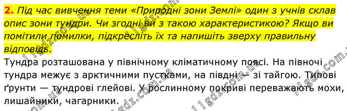 Під час вивчення теми «Природні зони Землі» один з учнів склав опис зони тундри. Чи згодні ви з такою характеристикою? Якщо ви помітили помилки, підкресліть їх та напишіть зверху правильну відповідь. Тундра розташована у північному кліматичному поясі. На півночі тундра межує з арктичними пустками, на півдні — зі тайгою. Типові ґрунти — тундрові глейові. У рослинному покриві переважають мохи, лишайники, чагарники.
