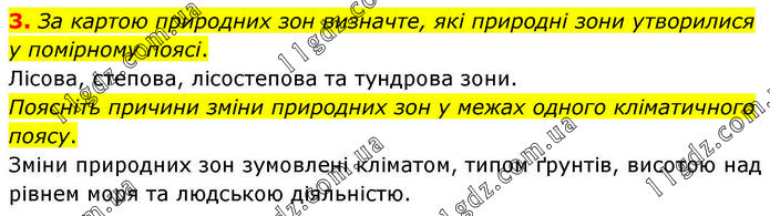 За картою природних зон визначте, які природні зони утворилися у помірному поясі. Лісова, степова, лісостепова та тундрова зони. Поясніть причини зміни природних зон у межах одного кліматичного поясу. Зміни природних зон зумовлені кліматом, типом ґрунтів, висотою над рівнем моря та людською діяльністю.