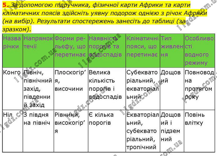 За допомогою підручника, фізичної карти Африки та карти кліматичних поясів здійсніть уявну подорож однією з річок Африки (на вибір). Результати спостережень занесіть до таблиці (за зразком).