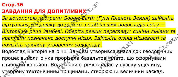 ЗАВДАННЯ ДЛЯ ДОПИТЛИВИХ За допомогою програми Google Earth (Гугл Планета Земля) здійсніть віртуальну мандрівку до одного з найбільших водоспадів світу — Вікторії на річці Замбезі. Оберіть режим перегляду: синіми лініями та крапками позначено доступні місця. Здійсніть огляд місцевості та поясніть причину утворення водоспаду. Водоспад Вікторія на річці Замбезі утворився внаслідок геологічних процесів, коли річка прорізала базальтові плато, що сформували глибокий каньйон. Вода річки стрімко падає у вузьку ущелину, утворену тектонічними тріщинами, створюючи величний каскад.