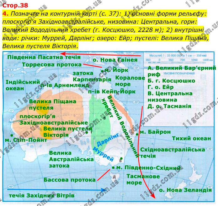 Позначте на контурній карті (с. 37): 1) основні форми рельєфу: плоскогір’я Західноавстралійське, низовина: Центральна, гори: Великий Вододільний хребет (г. Косцюшко, 2228 м); 2) внутрішні води: річки: Муррей, Дарлінг; озеро: Ейр; пустелі: Велика Піщана, Велика пустеля Вікторія.
