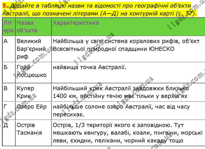 Додайте в таблицю назви та відомості про географічні об’єкти Австралії, що позначені літерами (А—Д) на контурній карті (с. 37). Літера Назва об’єкта Характеристика А Великий Бар'єрний риф Найбільша у світі система коралових рифів, об’єкт Всесвітньої природної спадщини ЮНЕСКО Б Гора Косцюшко найвища точка Австралії. В Купер Крик Найбільший крик Австралії завдовжки близько 1400 км, постійну течію має тільки у верхів’ях Г Озеро Ейр найбільше солоне озеро Австралії, час від часу пересихає. Д Острів Тасманія Острів, 1/3 території якого є заповідною. Тут мешкають кенгуру, валабі, коали, пінгвіни, морські леви, єхидни, пелікани, чорний какаду тощо