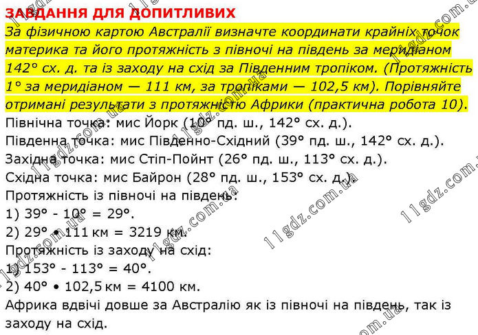 ЗАВДАННЯ ДЛЯ ДОПИТЛИВИХ За фізичною картою Австралії визначте координати крайніх точок материка та його протяжність з півночі на південь за меридіаном 142° сх. д. та із заходу на схід за Південним тропіком. (Протяжність 1° за меридіаном — 111 км, за тропіками — 102,5 км). Порівняйте отримані результати з протяжністю Африки (практична робота 10). Північна точка: мис Йорк (10° пд. ш., 142° сх. д.). Південна точка: мис Південно-Східний (39° пд. ш., 142° сх. д.). Західна точка: мис Стіп-Пойнт (26° пд. ш., 113° сх. д.). Східна точка: мис Байрон (28° пд. ш., 153° сх. д.). Протяжність із півночі на південь: 1) 39° - 10° = 29°. 2) 29° • 111 км = 3219 км. Протяжність із заходу на схід: 1) 153° - 113° = 40°. 2) 40° • 102,5 км = 4100 км. Африка вдвічі довше за Австралію як із півночі на південь, так із заходу на схід.