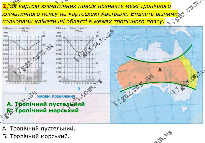 а картою кліматичних поясів позначте межі тропічного кліматичного поясу на картосхемі Австралії. Виділіть різними кольорами кліматичні області в межах тропічного поясу. А. Тропічний пустельний. Б. Тропічний морський.