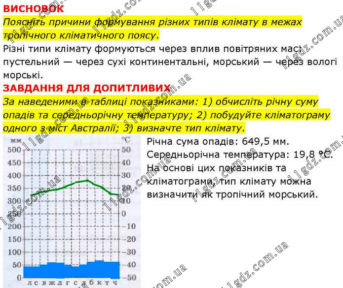 ВИСНОВОК Поясніть причини формування різних типів клімату в межах тропічного кліматичного поясу. Різні типи клімату формуються через вплив повітряних мас: пустельний — через сухі континентальні, морський — через вологі морські. ЗАВДАННЯ ДЛЯ ДОПИТЛИВИХ За наведеними в таблиці показниками: 1) обчисліть річну суму опадів та середньорічну температуру; 2) побудуйте кліматограму одного з міст Австралії; 3) визначте тип клімату. Річна сума опадів: 649,5 мм. Середньорічна температура: 19,8 °C. На основі цих показників та кліматограми, тип клімату можна визначити як тропічний морський.
