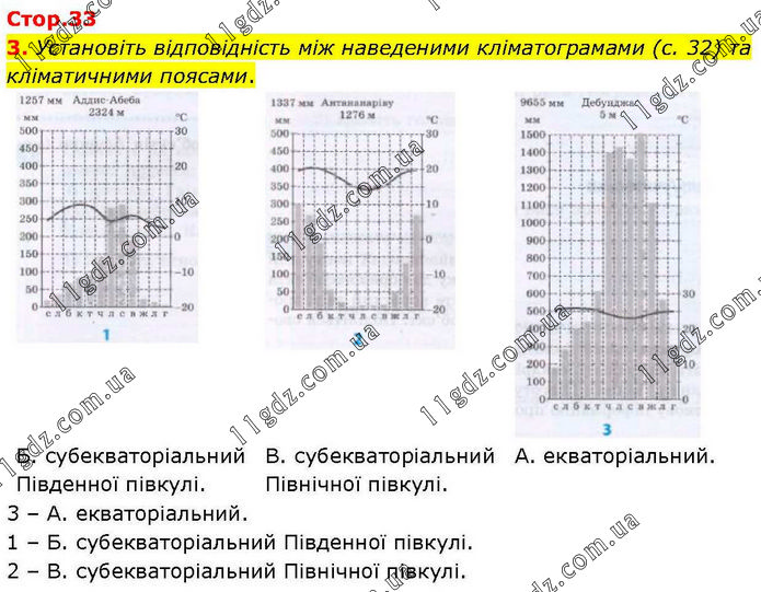 Установіть відповідність між наведеними кліматограмами (с. 32) та кліматичними поясами. 3 – А. екваторіальний. 1 – Б. субекваторіальний Південної півкулі. 2 – В. субекваторіальний Північної півкулі.