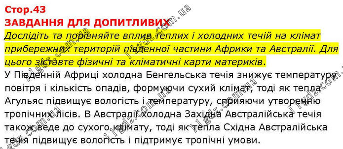 ЗАВДАННЯ ДЛЯ ДОПИТЛИВИХ Дослідіть та порівняйте вплив теплих і холодних течій на клімат прибережних територій південної частини Африки та Австралії. Для цього зіставте фізичні та кліматичні карти материків. У Південній Африці холодна Бенгельська течія знижує температуру повітря і кількість опадів, формуючи сухий клімат, тоді як тепла Агульяс підвищує вологість і температуру, сприяючи утворенню тропічних лісів. В Австралії холодна Західна Австралійська течія також веде до сухого клімату, тоді як тепла Східна Австралійська течія підвищує вологість і підтримує тропічні умови.