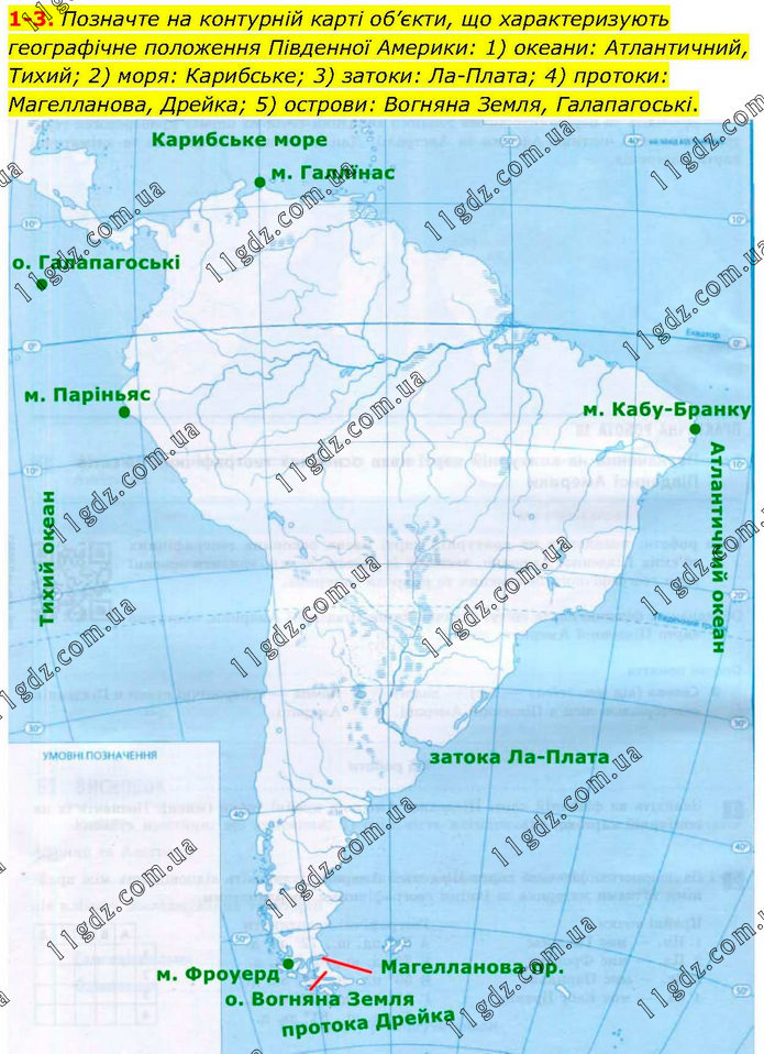Позначте на контурній карті об’єкти, що характеризують географічне положення Південної Америки: 1) океани: Атлантичний, Тихий; 2) моря: Карибське; 3) затоки: Ла-Плата; 4) протоки: Магелланова, Дрейка; 5) острови: Вогняна Земля, Галапагоські.
