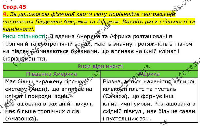 За допомогою фізичної карти світу порівняйте географічне положення Південної Америки та Африки. Виявіть риси спільності та відмінності. Риси спільності: Південна Америка та Африка розташовані в тропічній та субтропічній зонах, мають значну протяжність з півночі на південь, омиваються океанами, що впливає на їхній клімат і біорізноманіття. Риси відмінності Південна Америка Африка Має більш виражену гірську систему (Анди), що впливає на клімат і природні зони. Розташована в західній півкулі, має більше тропічних лісів (Амазонка). Відзначається наявністю великої кількості плато та пустель (Сахара), що формує інші кліматичні умови. Розташована в східній півкулі, має більше саван і пустельних зон.