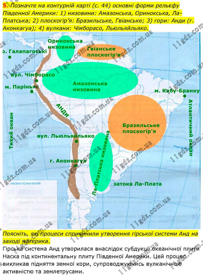 Позначте на контурній карті (с. 44) основні форми рельєфу Південної Америки: 1) низовини: Амазонська, Оринокська, Ла-Платська; 2) плоскогір’я: Бразильське, Гвіанське; 3) гори: Анди (г. Аконкагуа); 4) вулкани: Чімборасо, Льюльяйльяко. Поясніть, які процеси спричинили утворення гірської системи Анд на заході материка. Гірська система Анд утворилася внаслідок субдукції океанічної плити Наска під континентальну плиту Південної Америки. Цей процес викликав підняття земної кори, супроводжуючись вулканічною активністю та землетрусами.
