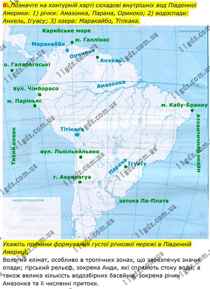Позначте на контурній карті складові внутрішніх вод Південної Америки: 1) річки: Амазонка, Парана, Ориноко; 2) водоспади: Анхель, Ігуасу; 3) озера: Маракайбо, Тітікака. Укажіть причини формування густої річкової мережі в Південній Америці. Вологий клімат, особливо в тропічних зонах, що забезпечує значні опади; гірський рельєф, зокрема Анди, які сприяють стоку води; а також велика кількість водозбірних басейнів, зокрема річки Амазонка та її численні притоки.