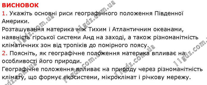 ВИСНОВОК 1. Укажіть основні риси географічного положення Південної Америки. Розташування материка між Тихим і Атлантичним океанами, наявність гірської системи Анд на заході, а також різноманітність кліматичних зон від тропіків до помірного поясу. 2. Поясніть, як географічне положення материка впливає на особливості його природи. Географічне положення впливає на природу через різноманітність клімату, що формує екосистеми, мікроклімат і річкову мережу.