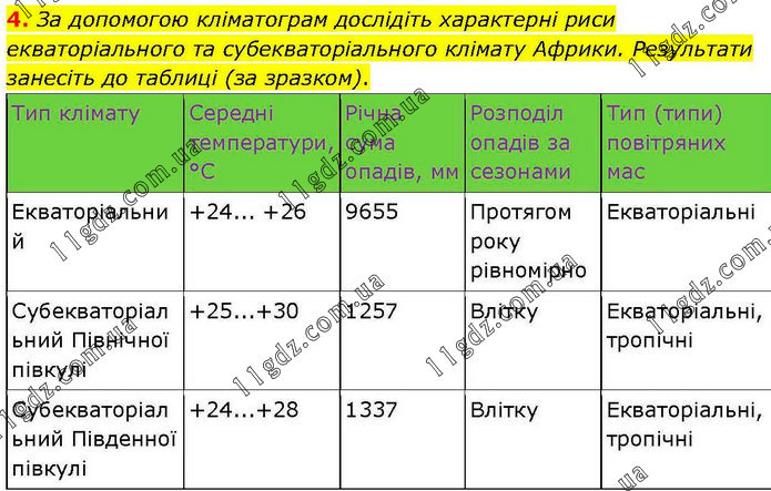 За допомогою кліматограм дослідіть характерні риси екваторіального та субекваторіального клімату Африки. Результати занесіть до таблиці (за зразком).