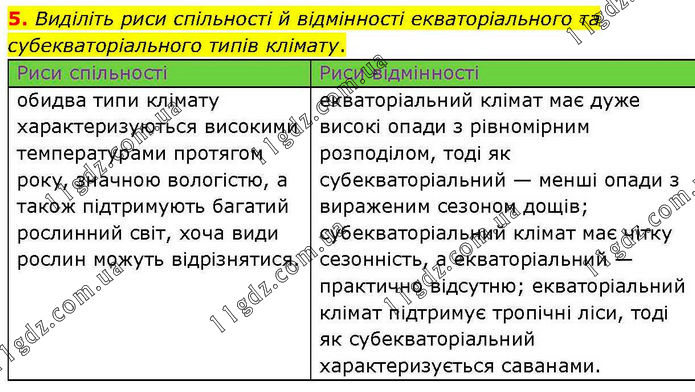 Виділіть риси спільності й відмінності екваторіального та субекваторіального типів клімату. Риси спільності Риси відмінності обидва типи клімату характеризуються високими температурами протягом року, значною вологістю, а також підтримують багатий рослинний світ, хоча види рослин можуть відрізнятися. екваторіальний клімат має дуже високі опади з рівномірним розподілом, тоді як субекваторіальний — менші опади з вираженим сезоном дощів; субекваторіальний клімат має чітку сезонність, а екваторіальний — практично відсутню; екваторіальний клімат підтримує тропічні ліси, тоді як субекваторіальний характеризується саванами.