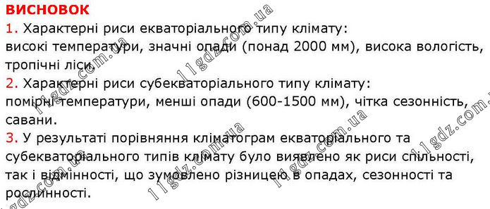 ВИСНОВОК 1. Характерні риси екваторіального типу клімату: високі температури, значні опади (понад 2000 мм), висока вологість, тропічні ліси. 2. Характерні риси субекваторіального типу клімату: помірні температури, менші опади (600-1500 мм), чітка сезонність, савани. 3. У результаті порівняння кліматограм екваторіального та субекваторіального типів клімату було виявлено як риси спільності, так і відмінності, що зумовлено різницею в опадах, сезонності та рослинності.