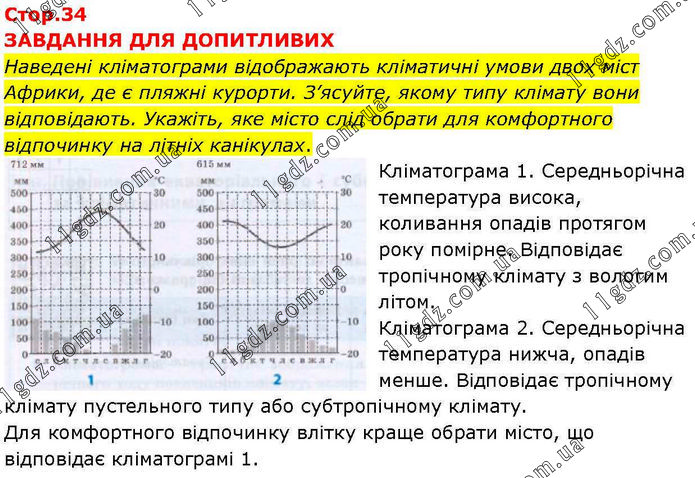 ЗАВДАННЯ ДЛЯ ДОПИТЛИВИХ Наведені кліматограми відображають кліматичні умови двох міст Африки, де є пляжні курорти. З’ясуйте, якому типу клімату вони відповідають. Укажіть, яке місто слід обрати для комфортного відпочинку на літніх канікулах. Кліматограма 1. Середньорічна температура висока, коливання опадів протягом року помірне. Відповідає тропічному клімату з вологим літом. Кліматограма 2. Середньорічна температура нижча, опадів менше. Відповідає тропічному клімату пустельного типу або субтропічному клімату. Для комфортного відпочинку влітку краще обрати місто, що відповідає кліматограмі 1.