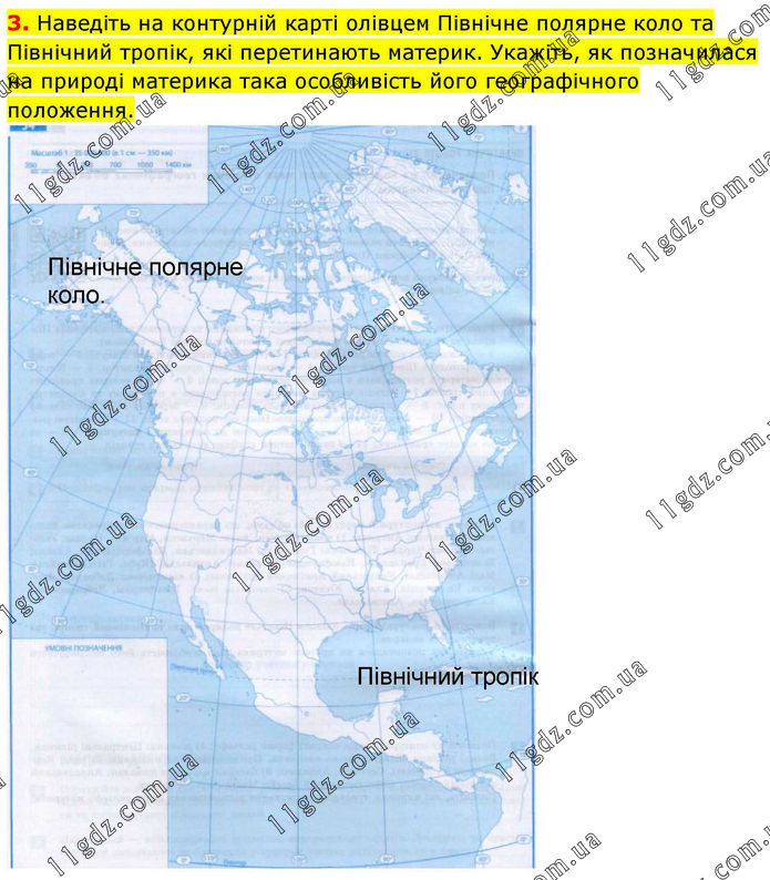 Наведіть на контурній карті олівцем Північне полярне коло та Північний тропік, які перетинають материк. Укажіть, як позначилася на природі материка така особливість його географічного положення.
