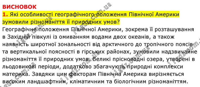 ВИСНОВОК 1. Які особливості географічного положення Північної Америки зумовили різноманіття її природних умов? Географічне положення Північної Америки, зокрема її розташування в Західній півкулі із омиванням водами двох океанів, а також наявність широтної зональності від арктичного до тропічного поясів та вертикальної поясності в гірських районах, зумовили надзвичайне різноманіття її природних умов. Великі прісноводні озера, утворені в льодовикові періоди, додатково збагачують природні комплекси материка. Завдяки цим факторам Північна Америка вирізняється високим ландшафтним, кліматичним та біологічним різноманіттям.