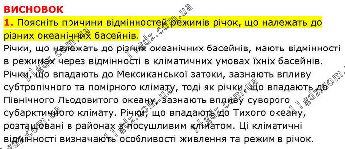ВИСНОВОК 1. Поясніть причини відмінностей режимів річок, що належать до різних океанічних басейнів. Річки, що належать до різних океанічних басейнів, мають відмінності в режимах через відмінності в кліматичних умовах їхніх басейнів. Річки, що впадають до Мексиканської затоки, зазнають впливу субтропічного та помірного клімату, тоді як річки, що впадають до Північного Льодовитого океану, зазнають впливу суворого субарктичного клімату. Річки, що впадають до Тихого океану, розташовані в районах з посушливим кліматом. Ці кліматичні відмінності визначають особливості живлення та режимів річок.