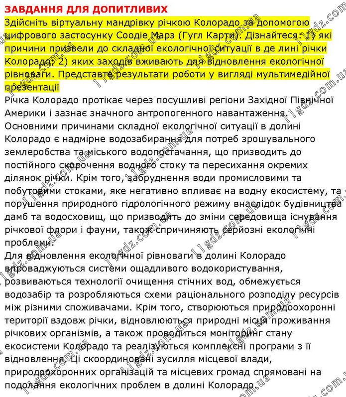 ЗАВДАННЯ ДЛЯ ДОПИТЛИВИХ Здійсніть віртуальну мандрівку річкою Колорадо за допомогою цифрового застосунку Соодіе Марз (Гугл Карти). Дізнайтеся: 1) які причини призвели до складної екологічної ситуації в де лині річки Колорадо; 2) яких заходів вживають для відновлення екологічної рівноваги. Представте результати роботи у вигляді мультимедійної презентації Річка Колорадо протікає через посушливі регіони Західної Північної Америки і зазнає значного антропогенного навантаження. Основними причинами складної екологічної ситуації в долині Колорадо є надмірне водозабирання для потреб зрошувального землеробства та міського водопостачання, що призводить до постійного скорочення водного стоку та пересихання окремих ділянок річки. Крім того, забруднення води промисловими та побутовими стоками, яке негативно впливає на водну екосистему, та порушення природного гідрологічного режиму внаслідок будівництва дамб та водосховищ, що призводить до зміни середовища існування річкової флори і фауни, також спричиняють серйозні екологічні проблеми. Для відновлення екологічної рівноваги в долині Колорадо впроваджуються системи ощадливого водокористування, розвиваються технології очищення стічних вод, обмежується водозабір та розробляються схеми раціонального розподілу ресурсів між різними споживачами. Крім того, створюються природоохоронні території вздовж річки, відновлюються природні місця проживання річкових організмів, а також проводиться моніторинг стану екосистеми Колорадо та реалізуються комплексні програми з її відновлення. Ці скоординовані зусилля місцевої влади, природоохоронних організацій та місцевих громад спрямовані на подолання екологічних проблем в долині Колорадо.