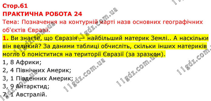 ПРАКТИЧНА РОБОТА 24 Тема: Позначення на контурній карті назв основних географічних об'єктів Євразії. 1. Ви знаєте, що Євразія — найбільший материк Землі.. А наскільки він великий? За даними таблиці обчисліть, скільки інших материків могло б поміститися на території Євразії (за зразком). 1, 8 Африки; 2, 4 Північних Америк; 3, 1 Південних Америк; 3, 9 Антарктид; 7, 1 Австралій.