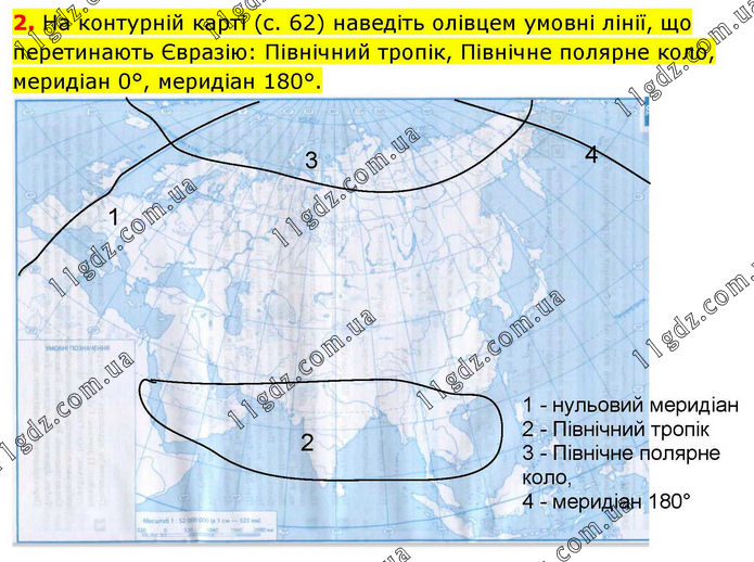 На контурній карті (с. 62) наведіть олівцем умовні лінії, що перетинають Євразію: Північний тропік, Північне полярне коло, меридіан 0°, меридіан 180°.