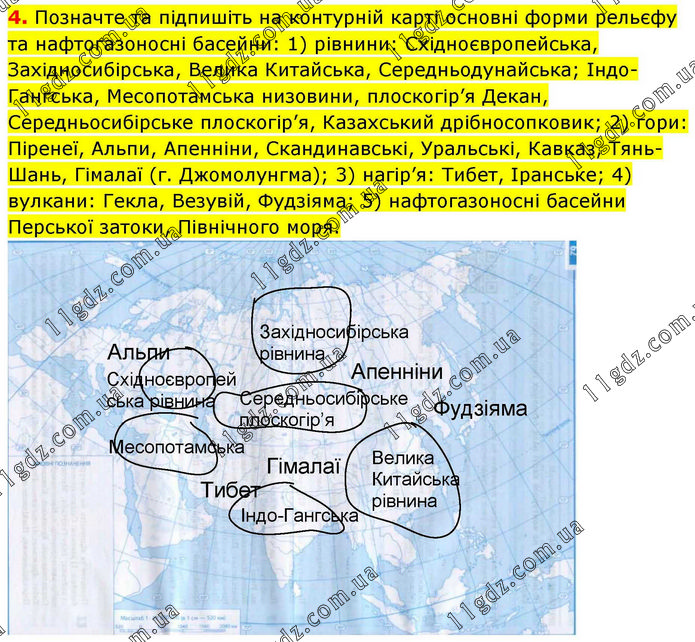 Позначте та підпишіть на контурній карті основні форми рельєфу та нафтогазоносні басейни: 1) рівнини: Східноєвропейська, Західносибірська, Велика Китайська, Середньодунайська; Індо-Гангська, Месопотамська низовини, плоскогір’я Декан, Середньосибірське плоскогір’я, Казахський дрібносопковик; 2) гори: Піренеї, Альпи, Апенніни, Скандинавські, Уральські, Кавказ, Тянь-Шань, Гімалаї (г. Джомолунгма); 3) нагір’я: Тибет, Іранське; 4) вулкани: Гекла, Везувій, Фудзіяма; 5) нафтогазоносні басейни Перської затоки, Північного моря.