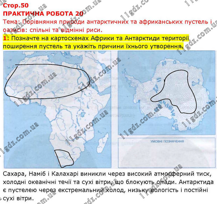 ПРАКТИЧНА РОБОТА 20 Тема: Порівняння природи антарктичних та африканських пустель і оазисів: спільні та відмінні риси. 1. Позначте на картосхемах Африки та Антарктиди території поширення пустель та укажіть причини їхнього утворення. Сахара, Наміб і Калахарі виникли через високий атмосферний тиск, холодні океанічні течії та сухі вітри, що блокують опади. Антарктида є пустелею через екстремальний холод, низьку вологість і постійні сухі вітри.