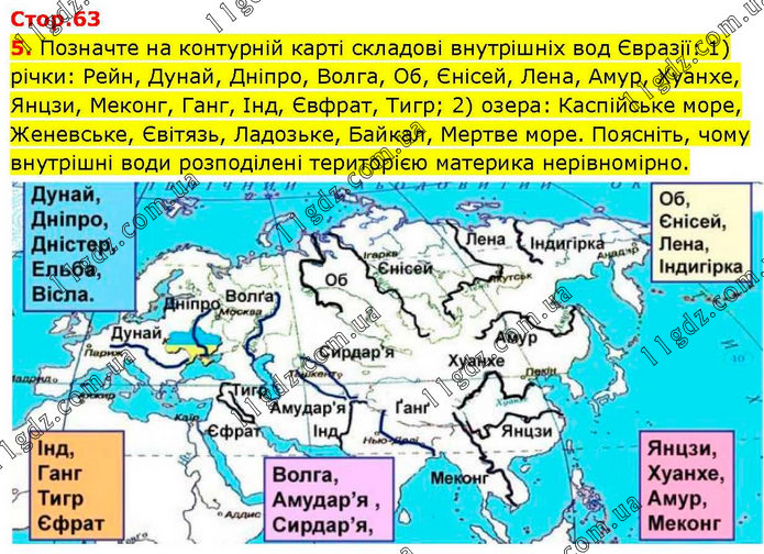 Позначте на контурній карті складові внутрішніх вод Євразії: 1) річки: Рейн, Дунай, Дніпро, Волга, Об, Єнісей, Лена, Амур, Хуанхе, Янцзи, Меконг, Ганг, Інд, Євфрат, Тигр; 2) озера: Каспійське море, Женевське, Євітязь, Ладозьке, Байкал, Мертве море. Поясніть, чому внутрішні води розподілені територією материка нерівномірно.