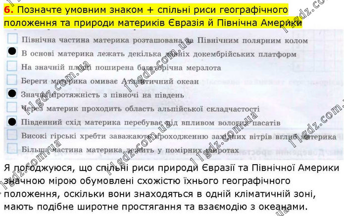 Позначте умовним знаком + спільні риси географічного положення та природи материків Євразія й Північна Америки Я погоджуюся, що спільні риси природи Євразії та Північної Америки значною мірою обумовлені схожістю їхнього географічного положення, оскільки вони знаходяться в одній кліматичній зоні, мають подібне широтне простягання та взаємодію з океанами.