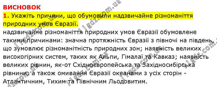 ВИСНОВОК 1. Укажіть причини, що обумовили надзвичайне різноманіття природних умов Євразії. надзвичайне різноманіття природних умов Євразії обумовлене такими причинами: значна протяжність Євразії з півночі на південь, що зумовлює різноманітність природних зон; наявність великих високогірних систем, таких як Альпи, Гімалаї та Кавказ; наявність великих рівнин, як-от Східноєвропейська та Західносибірська рівнини; а також омивання Євразії океанами з усіх сторін - Атлантичним, Тихим та Північним Льодовитим.