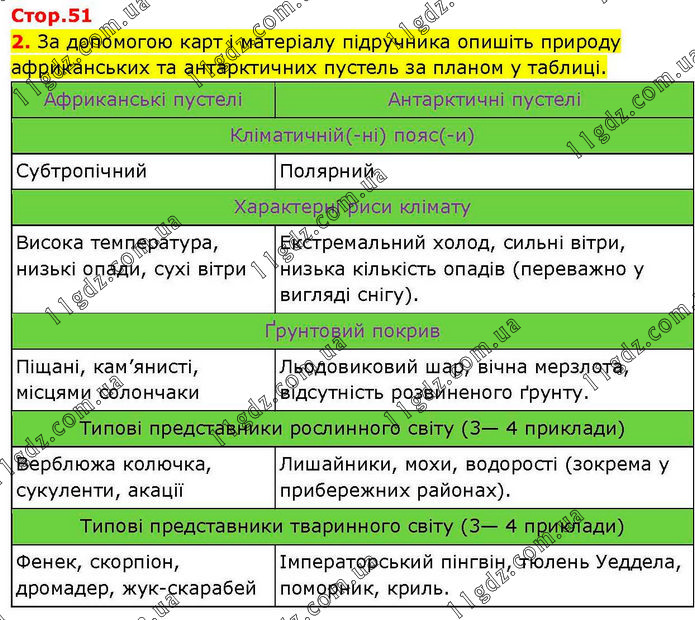 За допомогою карт і матеріалу підручника опишіть природу африканських та антарктичних пустель за планом у таблиці. Африканські пустелі Антарктичні пустелі Кліматичній(-ні) пояс(-и) Субтропічний Полярний Характерні риси клімату Висока температура, низькі опади, сухі вітри Екстремальний холод, сильні вітри, низька кількість опадів (переважно у вигляді снігу). Ґрунтовий покрив Піщані, кам’янисті, місцями солончаки Льодовиковий шар, вічна мерзлота, відсутність розвиненого ґрунту. Типові представники рослинного світу (3— 4 приклади) Верблюжа колючка, сукуленти, акації Лишайники, мохи, водорості (зокрема у прибережних районах). Типові представники тваринного світу (3— 4 приклади) Фенек, скорпіон, дромадер, жук-скарабей Імператорський пінгвін, тюлень Уеддела, поморник, криль.