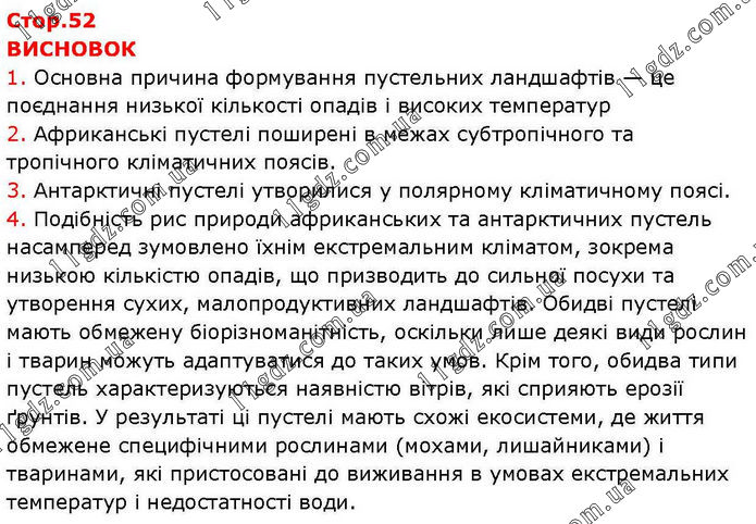 ВИСНОВОК 1. Основна причина формування пустельних ландшафтів — це поєднання низької кількості опадів і високих температур 2. Африканські пустелі поширені в межах субтропічного та тропічного кліматичних поясів. 3. Антарктичні пустелі утворилися у полярному кліматичному поясі. 4. Подібність рис природи африканських та антарктичних пустель насамперед зумовлено їхнім екстремальним кліматом, зокрема низькою кількістю опадів, що призводить до сильної посухи та утворення сухих, малопродуктивних ландшафтів. Обидві пустелі мають обмежену біорізноманітність, оскільки лише деякі види рослин і тварин можуть адаптуватися до таких умов. Крім того, обидва типи пустель характеризуються наявністю вітрів, які сприяють ерозії ґрунтів. У результаті ці пустелі мають схожі екосистеми, де життя обмежене специфічними рослинами (мохами, лишайниками) і тваринами, які пристосовані до виживання в умовах екстремальних температур і недостатності води.