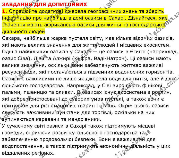 ЗАВДАННЯ ДЛЯ ДОПИТЛИВИХ 1. Опрацюйте додаткові джерела географічних знань та зберіть інформацію про найбільш відомі оазиси в Сахарі. Дізнайтеся, яке значення мають африканські оазиси для життя та господарської діяльності людей Сахара, найбільша жарка пустеля світу, має кілька відомих оазисів, які мають велике значення для життя людей і місцевих екосистем. Одні з найбільших оазисів у Сахарі — це оазиси в Єгипті (наприклад, оазис Сіва), Лівії та Алжирі (Куфра, Ваді-Натрон). Ці оазиси мають велике значення, оскільки вони забезпечують життєво важливі ресурси води, які постачаються з підземних водоносних горизонтів. Оазиси є важливими не лише як джерела води для пиття, але й для сільського господарства. Наприклад, у Сіві вирощують фінікові пальми, пшеницю та оливки. В оазисах існує екосистема з рослин, які добре пристосовані до суворих умов пустелі, а також вони є притулком для різноманітних тварин і птахів. Окрім цього, оазиси слугують важливими пунктами для торгівлі, оскільки на них зупиняються каравани та мандрівники. У сучасному світі оазиси в Сахарі також підтримують місцеві громади, сприяючи розвитку сільського господарства та забезпеченню продовольчої безпеки. Вони є важливими для водопостачання, а також підтримують економічну діяльність у цих віддалених регіонах.
