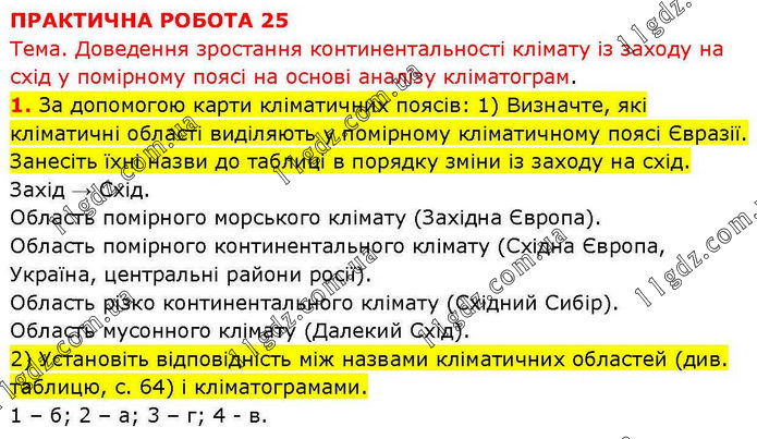 ПРАКТИЧНА РОБОТА 25 Тема. Доведення зростання континентальності клімату із заходу на схід у помірному поясі на основі аналізу кліматограм. 1. За допомогою карти кліматичних поясів: 1) Визначте, які кліматичні області виділяють у помірному кліматичному поясі Євразії. Занесіть їхні назви до таблиці в порядку зміни із заходу на схід. Захід → Схід. Область помірного морського клімату (Західна Європа). Область помірного континентального клімату (Східна Європа, Україна, центральні райони росії). Область різко континентального клімату (Східний Сибір). Область мусонного клімату (Далекий Схід). 2) Установіть відповідність між назвами кліматичних областей (див. таблицю, с. 64) і кліматограмами. 1 – б; 2 – а; 3 – г; 4 - в.