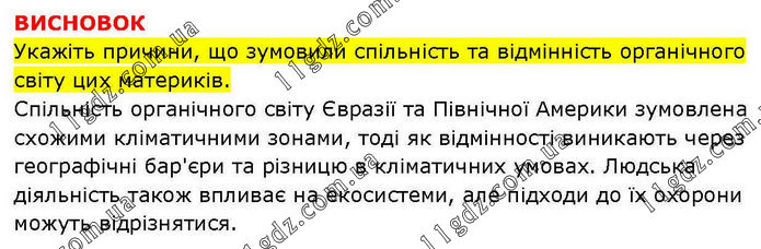 ВИСНОВОК Укажіть причини, що зумовили спільність та відмінність органічного світу цих материків. Спільність органічного світу Євразії та Північної Америки зумовлена схожими кліматичними зонами, тоді як відмінності виникають через географічні бар'єри та різницю в кліматичних умовах. Людська діяльність також впливає на екосистеми, але підходи до їх охорони можуть відрізнятися.
