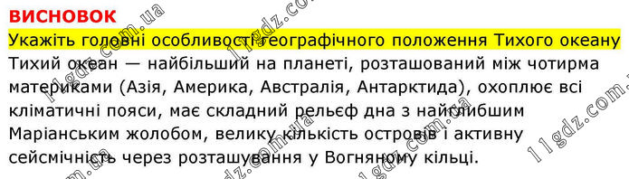 ВИСНОВОК Укажіть головні особливості географічного положення Тихого океану Тихий океан — найбільший на планеті, розташований між чотирма материками (Азія, Америка, Австралія, Антарктида), охоплює всі кліматичні пояси, має складний рельєф дна з найглибшим Маріанським жолобом, велику кількість островів і активну сейсмічність через розташування у Вогняному кільці.