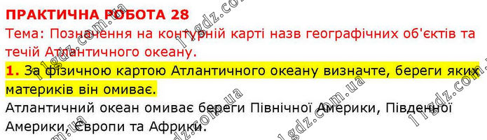 ПРАКТИЧНА РОБОТА 28 Тема: Позначення на контурній карті назв географічних об'єктів та течій Атлантичного океану. 1. За фізичною картою Атлантичного океану визначте, береги яких материків він омиває. Атлантичний океан омиває береги Північної Америки, Південної Америки, Європи та Африки.