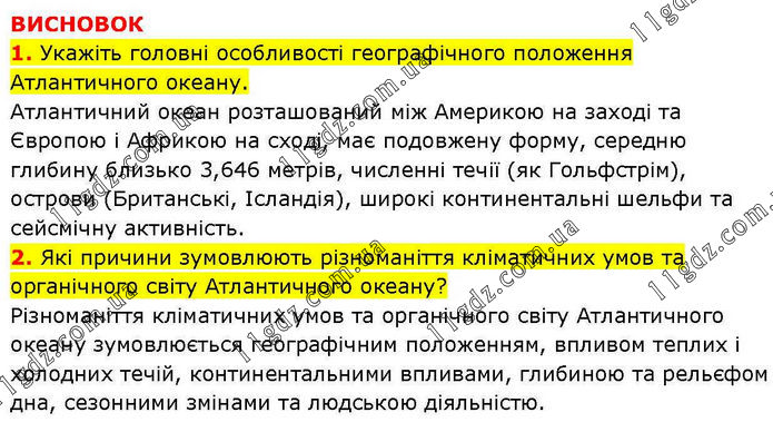 ВИСНОВОК 1. Укажіть головні особливості географічного положення Атлантичного океану. Атлантичний океан розташований між Америкою на заході та Європою і Африкою на сході, має подовжену форму, середню глибину близько 3,646 метрів, численні течії (як Гольфстрім), острови (Британські, Ісландія), широкі континентальні шельфи та сейсмічну активність. 2. Які причини зумовлюють різноманіття кліматичних умов та органічного світу Атлантичного океану? Різноманіття кліматичних умов та органічного світу Атлантичного океану зумовлюється географічним положенням, впливом теплих і холодних течій, континентальними впливами, глибиною та рельєфом дна, сезонними змінами та людською діяльністю.