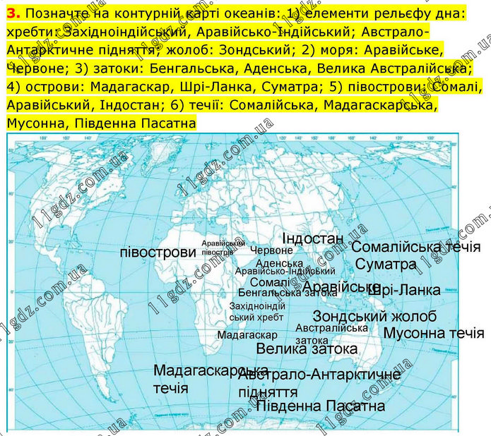 Позначте на контурній карті океанів: 1) елементи рельєфу дна: хребти: Західноіндійський, Аравійсько-Індійський; Австрало-Антарктичне підняття; жолоб: Зондський; 2) моря: Аравійське, Червоне; 3) затоки: Бенгальська, Аденська, Велика Австралійська; 4) острови: Мадагаскар, Шрі-Ланка, Суматра; 5) півострови: Сомалі, Аравійський, Індостан; 6) течії: Сомалійська, Мадагаскарська, Мусонна, Південна Пасатна