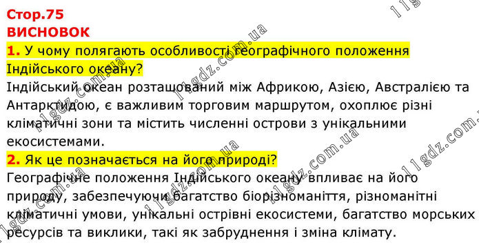 ВИСНОВОК 1. У чому полягають особливості географічного положення Індійського океану? Індійський океан розташований між Африкою, Азією, Австралією та Антарктидою, є важливим торговим маршрутом, охоплює різні кліматичні зони та містить численні острови з унікальними екосистемами. 2. Як це позначається на його природі? Географічне положення Індійського океану впливає на його природу, забезпечуючи багатство біорізноманіття, різноманітні кліматичні умови, унікальні острівні екосистеми, багатство морських ресурсів та виклики, такі як забруднення і зміна клімату.
