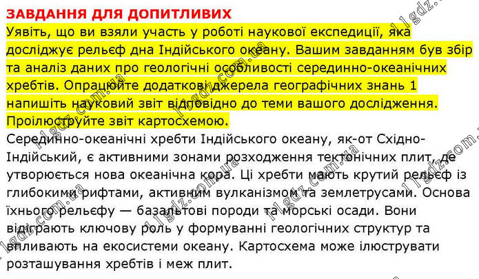 ЗАВДАННЯ ДЛЯ ДОПИТЛИВИХ Уявіть, що ви взяли участь у роботі наукової експедиції, яка досліджує рельєф дна Індійського океану. Вашим завданням був збір та аналіз даних про геологічні особливості серединно-океанічних хребтів. Опрацюйте додаткові джерела географічних знань 1 напишіть науковий звіт відповідно до теми вашого дослідження. Проілюструйте звіт картосхемою. Серединно-океанічні хребти Індійського океану, як-от Східно-Індійський, є активними зонами розходження тектонічних плит, де утворюється нова океанічна кора. Ці хребти мають крутий рельєф із глибокими рифтами, активним вулканізмом та землетрусами. Основа їхнього рельєфу — базальтові породи та морські осади. Вони відіграють ключову роль у формуванні геологічних структур та впливають на екосистеми океану. Картосхема може ілюструвати розташування хребтів і меж плит.