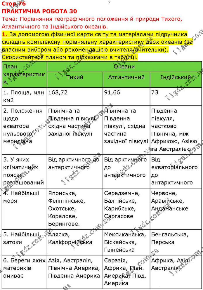 ПРАКТИЧНА РОБОТА 30 Тема: Порівняння географічного положення й природи Тихого, Атлантичного та Індійського океанів. 1. За допомогою фізичної карти світу та матеріалами підручника складіть комплексну порівняльну характеристику двох океанів (за власним вибором або рекомендацією вчителя/вчительки). Скористайтеся планом та підказками в таблиці.