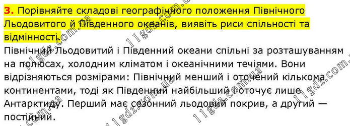Порівняйте складові географічного положення Північного Льодовитого й Південного океанів, виявіть риси спільності та відмінності. Північний Льодовитий і Південний океани спільні за розташуванням на полюсах, холодним кліматом і океанічними течіями. Вони відрізняються розмірами: Північний менший і оточений кількома континентами, тоді як Південний найбільший і оточує лише Антарктиду. Перший має сезонний льодовий покрив, а другий — постійний.