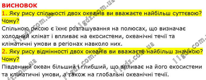 ВИСНОВОК 1. Яку рису спільності двох океанів ви вважаєте найбільш суттєвою? Чому? Спільною рисою є їхнє розташування на полюсах, що визначає холодний клімат і впливає на екосистеми, океанічні течії та кліматичні умови в регіонах навколо них. 2. Яку рису відмінності двох океанів ви вважаєте найбільш значною? Чому? Південний океан більший і глибший, що впливає на його екосистеми та кліматичні умови, а також на глобальні океанічні течії.